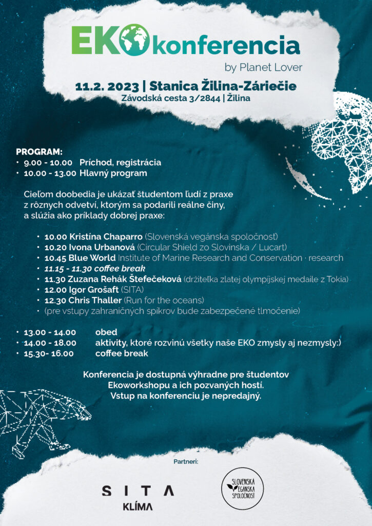 Vo februári 2023 sme v Žiline organizovali prvú EKOkonferenciu pre našich študentov. Konferencia je súčasťou Ekoworkshopu – celoročného krúžku, v ktorom sa stredoškolskí študenti môžu rozvýjať v témach ako voda, oceán, pôda, klimatická zmena atď.. Cieľom konferencie bolo ukázať študentom príklady dobrej praxe, a ľudí, ktorí reálne v rámci ochrany životného prostredia niečo robia alebo už dokázali. Preto sme okrem tréningových aktivít pozvali aj týchto úžasných hostí, ktorí na naše veľké šťastie prijali pozvanie: